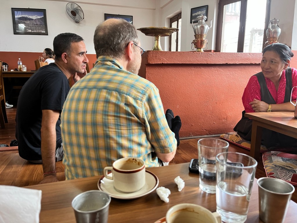 Salut les copains! Magnifique angle-photo de la grande Stupa; chouette de voir le Jean-François intentionnellement attentionné dans son interaction avec une dame au resto; Pierre je t’imagine du derrière la caméra…! Hugs, Dan