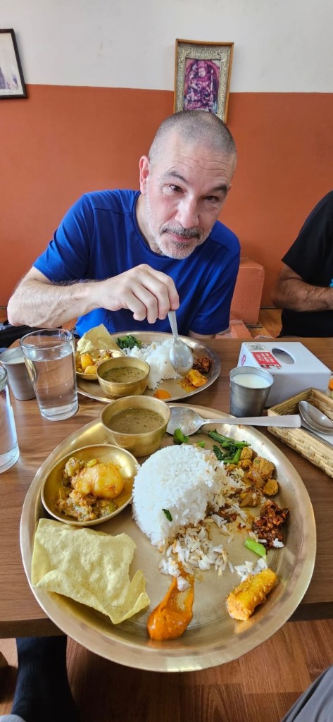 Nous sommes en Asie blottis contre la suprême chaîne Himalayenne, à un saut de puce de Sagarmatha communément appelée Everest. Un pays éloigné un peu comme notre grand nord, où il est parfois difficile de se tirer une vie. Rien n’est facile ou simple, à flanc de montagne à pic et avec des intempéries géants des tremblements de terre inimaginables. Bref, ici le plat qui se mange par tous c’est le dhal baht, une assiette divisée en trois, comme l’assiette méditerranéenne. La différence c’est que la moitié c’est du riz blanc, un quart ce sont des lentilles et l’autre quart ce sont des légumes au cari.