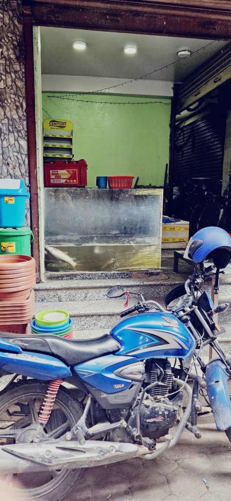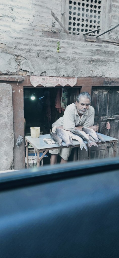 C’est sûr que moi je regarde les étales de poissons , car il y en a, mais précaution exige, à 600 km du plus proche océan, soit Calcutta au bout de la mer du Bengal, je m’abstiens. Aussi pcq j’entends le comité me dire, avec une pointe non négligeable de cynisme, « je te l’avais dit de ne pas manger de poisson à moins que tu vois la mer».