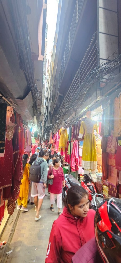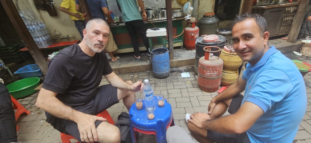 Par exemple, on se fraie un chemin à la suite de Sundar dans la foule dense et, hop on vire soudainement dans un corridor-tunnel très sombres, étroit ,un peu prosterné pour ne pas se cogner la tête. A chaque fois on surgit dans une cour intérieure, un oasis urbain, restaurants-cuisines à ciel ouvert, achalandés qui prospèrent très bien. Pierre et moi avons le sourire fendu jusqu’aux oreilles