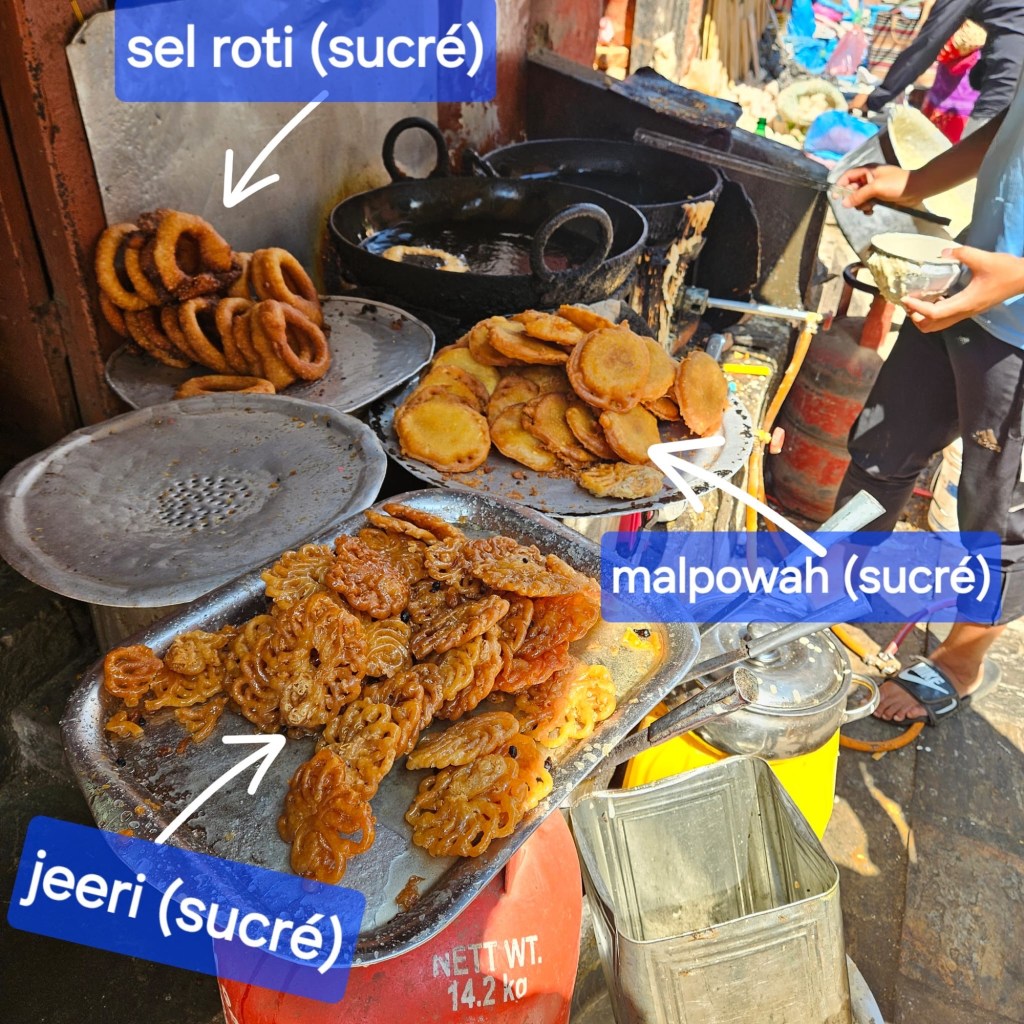 sucré notre bec aux selrotis, beignes à la farine de riz. Goulûment dégustés dans le fond d’une cour, nulle part , mais tout de même sous le regard bienveillant de Ganesh;