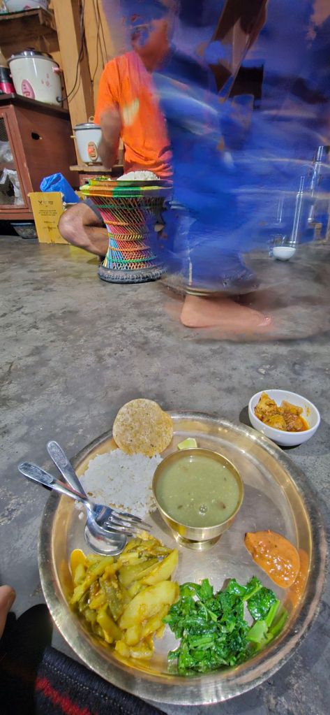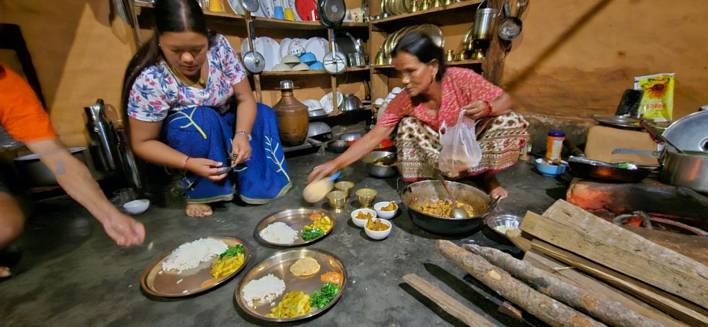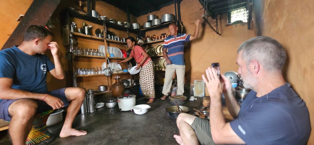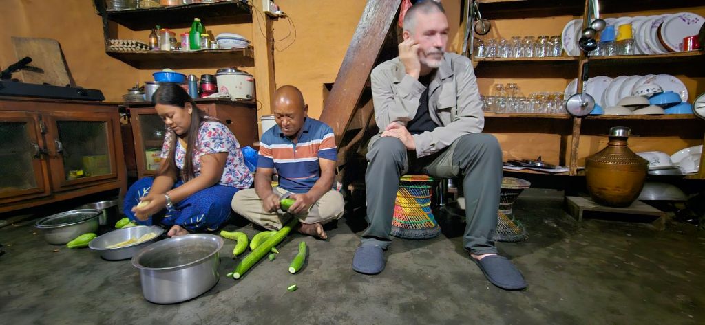 Assis en tailleur, nous mangeons avec appétit ce très savoureux Dahl Bhat, dans une ambiance active, car nous assis entre Neha qui veille au feu et sa fille qui passe devant pour prendre les assiètes prêtes et leur fils qui sert les bières et le roxy aux invités. Roxy, un alcool de riz fermenté transparent et brutal.