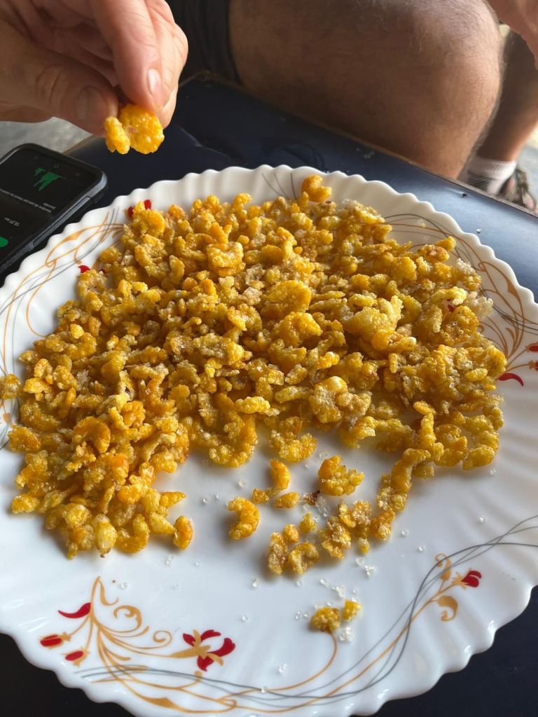 Neha la maîtresse de la maison nous prépare de son thé et du «pop corn». Les grain de maïs sont partiellement écrapous et ensuite frits. Donc rien de gonflé, nouvelle saveur agréable et croquante, à tenter à la maison, préparez vous…